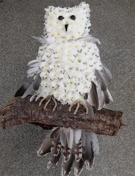 This beautiful owl tribute created by our team here at the selsey florist a flowered owl on a wooden log and
