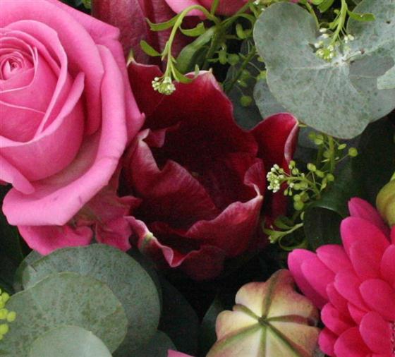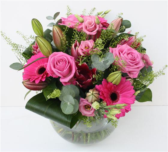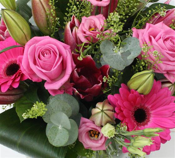 A cocktail of pinks, including aqua roses, cerise pink gerberas, lisianthus and fragrant lilies mingled with contemporary foliage.