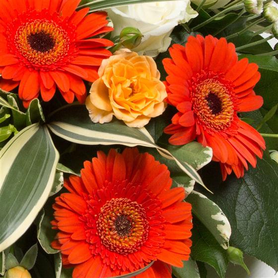 A modern sectioned posy arrangement in whites, limes and oranges.
