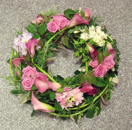 Pink Roses, Pink Callas, and Lisianthus Funeral Wreath: A Tender Farewell