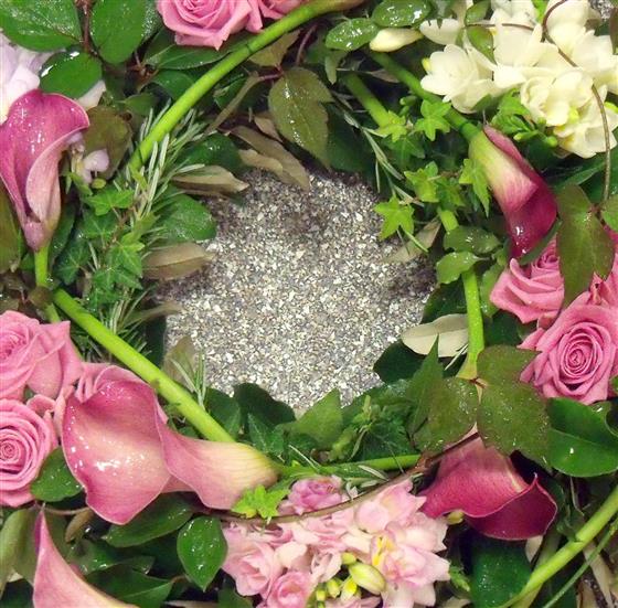Let this funeral wreath, adorned with pink roses, pink callas, and lisianthus, be a tender and heartfelt farewell, a symbol of gratitude and remembrance, and a testament to the love and respect that remains in your heart.