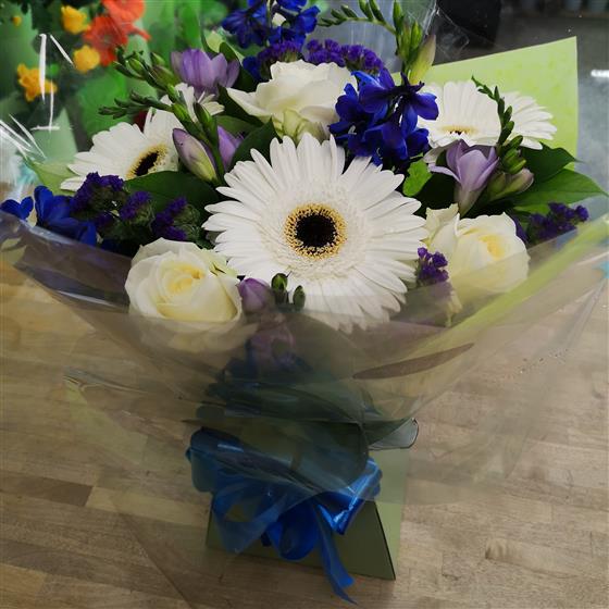 A beautiful hand-tied bouquet in aqua-pack ready for display , with blue and white flowers. New baby boy? new beach house? this is a perfect gift.